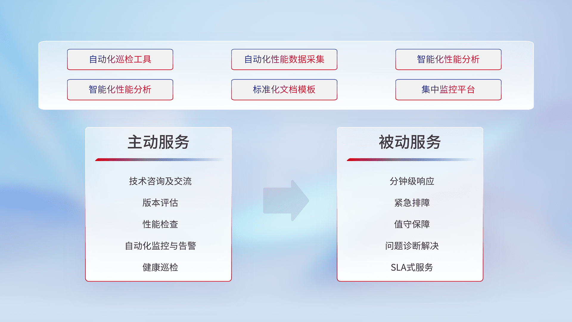 智能化工具和标准化文档,,,保障服务质量,,,提供主动服务(包含技术咨询、、版本评估、、、性能检查、、、自动化监控与告警、、、健康巡检)和被动服务包含(分钟级响应、、、、紧急排障、、、值守保障、、、问题诊断解决、、、SLA服务)。。
