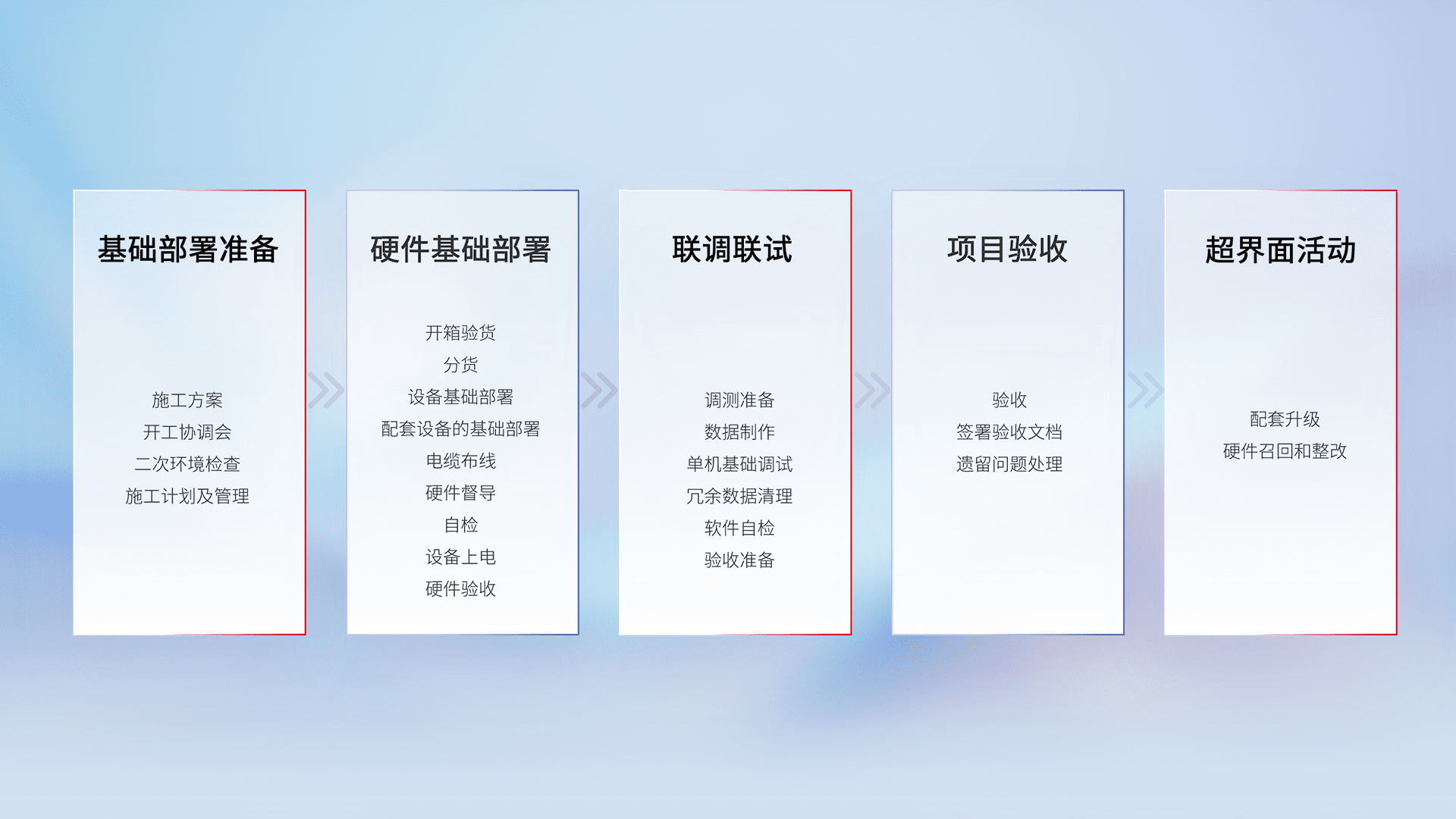 从基础部署准备、、、、硬件基础部署、、联调联试、、、项目验收、、、、越界面活动的全过程可追溯,,,,保证施工质量和进度。。